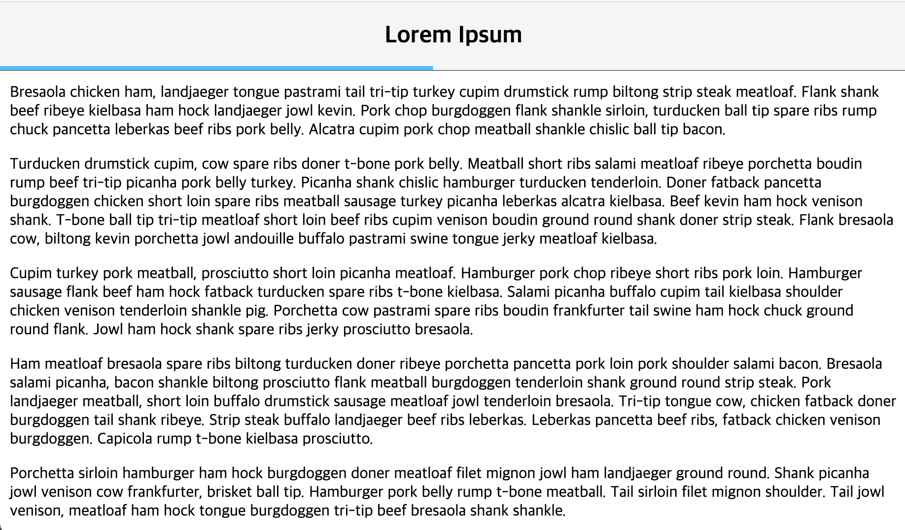 스크롤 인디케이터(스크롤 상태 표시기)란 스크롤을 할 때 현재 스크롤된 영역이 전체 컨텐츠 영역의 몇 % 진행되었는가를 나타내는 표식입니다. 아래 그림에서 파란색 선이 스크롤 인디케이터입니다.