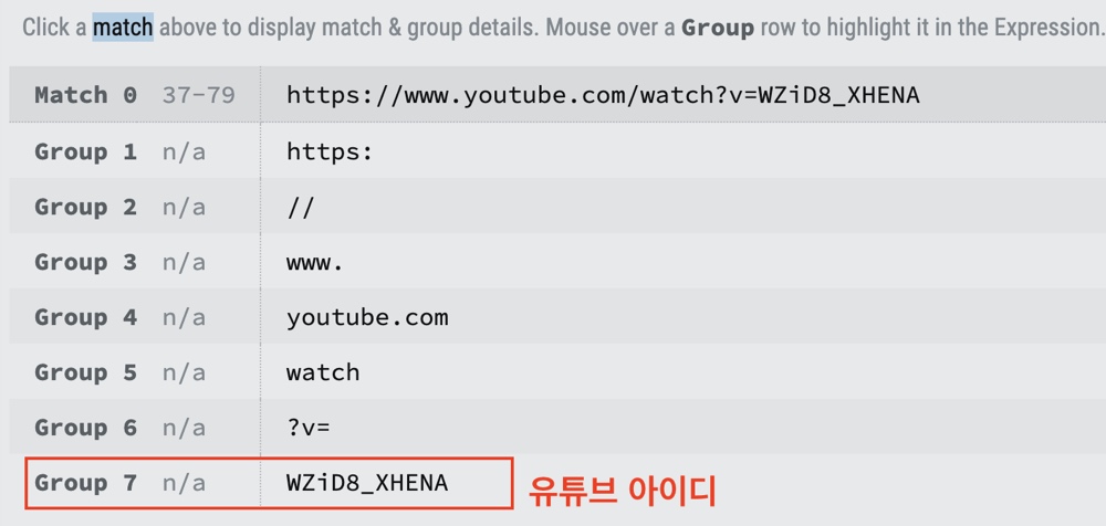 위의 정규식에 따르면, 정규식 매치 결과의 그룹 목록 중 7번($7)이 유튜브 동영상의 ID를 담고 있습니다. container 변수는 실제로 유튜브에서 공식적으로 제공하는 iframe 플레이어 태그 부분이며, 아이디 위치 부분(#ID#)을 실제 아이디로 대체하여 해당 동영상을 재생하도록 합니다. groups 배열에서는 6번째 원소에 아이디가 담겨 있으므로 groups[6] 을 사용합니다.
