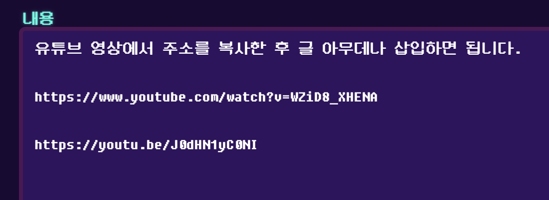 유튜브 영상에서 주소를 복사한 후 글 아무데나 삽입하면 됩니다.