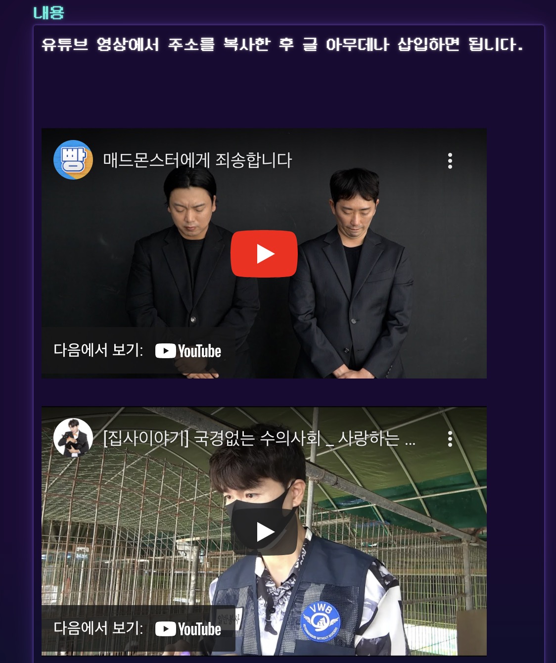 이 예제는 아래와 같이 게시판 등에서 글을 작성할 때 유튜브 주소를 추가하면, 해당 주소에서 유튜브 동영상 ID를 추출한 후 iframe 플레이어 형태로 변환합니다.