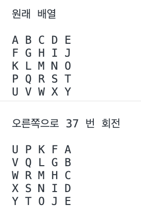 아래는 알파벳 A 부터 Y 까지 25자로 이루어진 (5 * 5) 크기의 2차원 배열을 만드는 과정입니다.