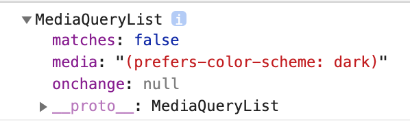 true 이면 다크모드이며, false 이면 라이트모드 혹은 “운영체제에서 명시된 정보가 없음” 입니다. (라이트모드 감지는 위의 코드에서'(prefers-color-scheme: Dark)'를'(prefers-color-scheme: Light)'로 치환)