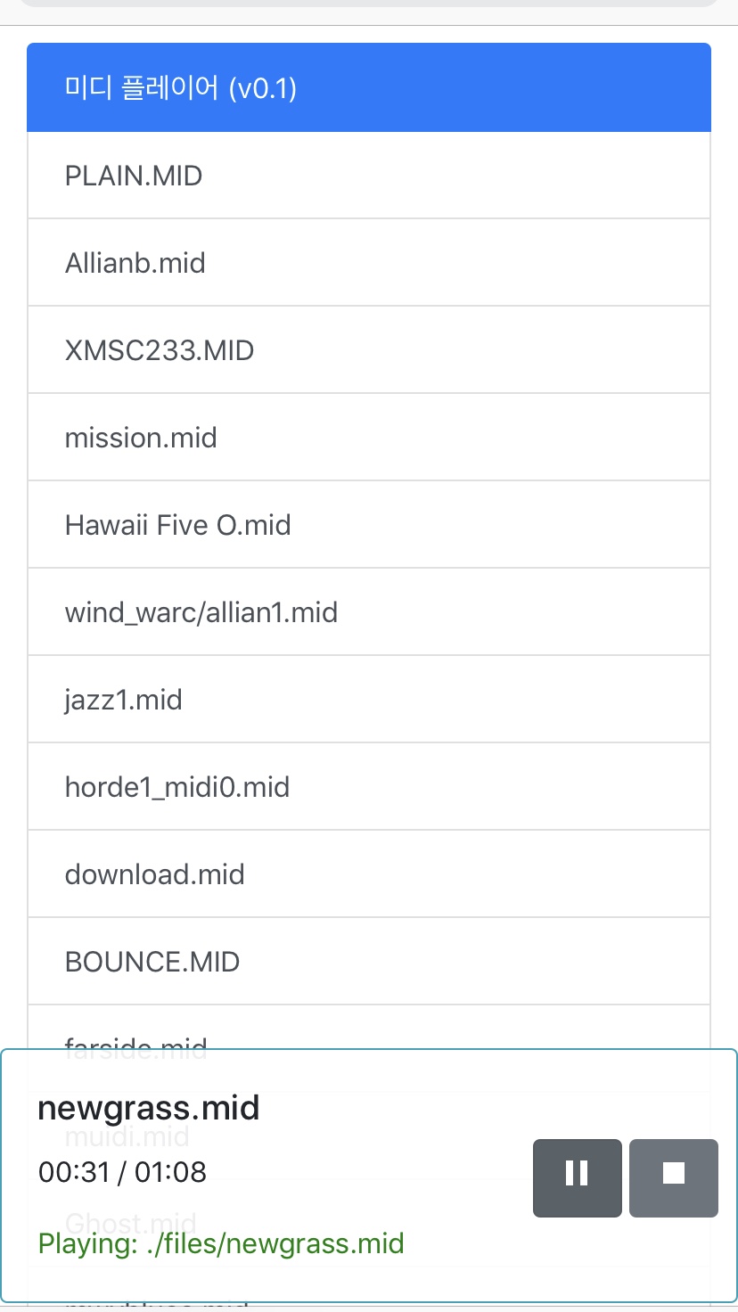 - MIDI.js 라이브러리를 이용한 미디파일 재생, 일시정지 및 정지