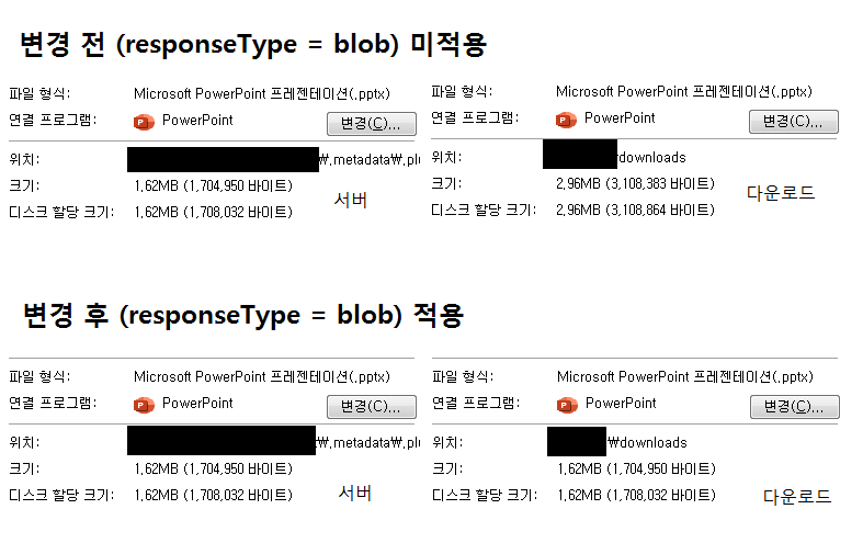 스프링을 통해 바이너리 파일을 다운로드하는 기능을 AJAX로 구현하려 했는데 서버에서는 용량이 1.5MB인 파일이 다운로드 될 때는 3MB로 부풀려져서 다운로드 되는 문제가 있었습니다. 파일이 깨진것이며 복구 불가능한 상태였습니다.