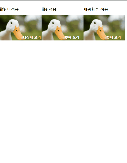 이 코드는 일반적인 생각대로 실행되지 않습니다. 결과는 1초 뒤에 한꺼번에 ‘다섯째 오리’만 다섯 마리 복제되며 나머지 오리들은 등장하지도 않습니다.