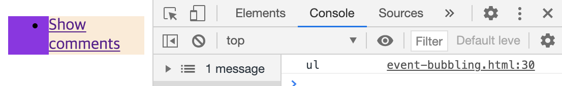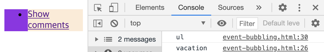 보라색 부분을 클릭하면 <li> 태그에 할당된 이벤트까지 실행이 됩니다. <li> 태그에서 이벤트가 멈춘 이유는 여기의 이벤트는 캡처 옵션이 false이기 때문입니다.