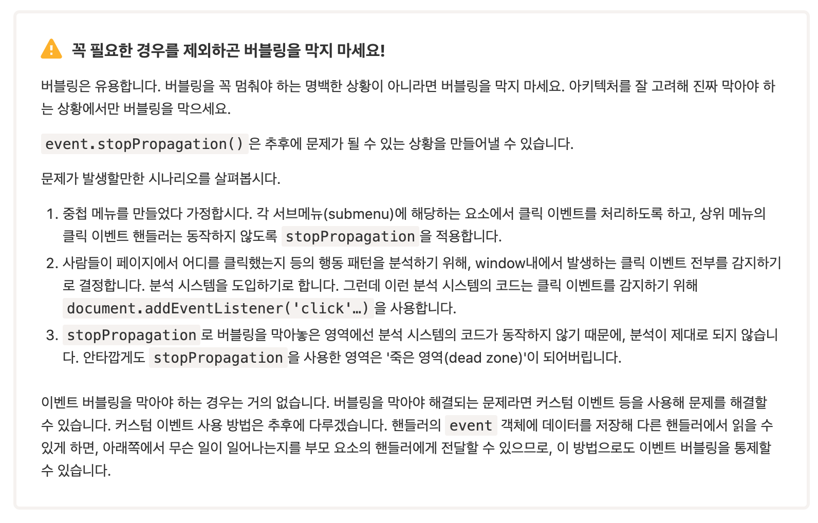 이벤트 버블링을 막는 행위는 지양하는 것이 좋다고 합니다. (이유)