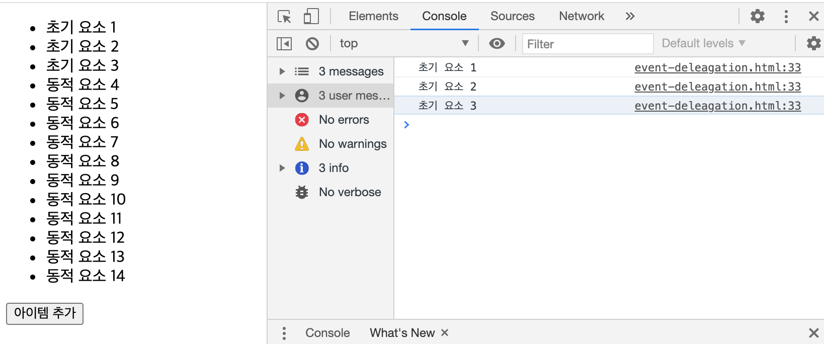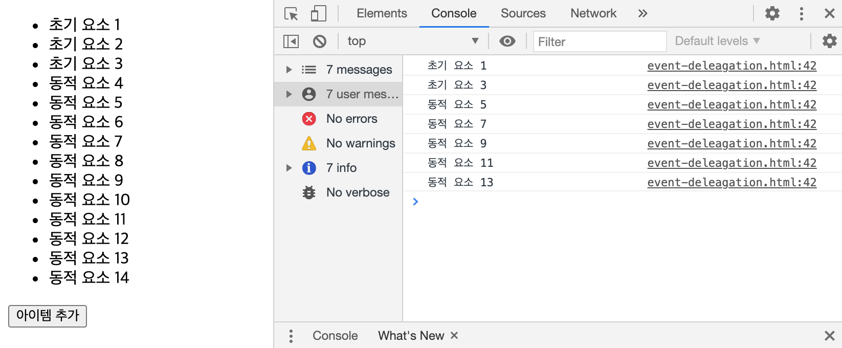 물론 $li DOM을 생성할 때 이벤트를 추가한 뒤 appendChild하면 동적요소에도 이벤트가 부여될 수 있습니다. 하지만 이 방법 자체가 요소마다 이벤트를 부여하는 것이라 시스템 자원의 낭비가 있습니다.