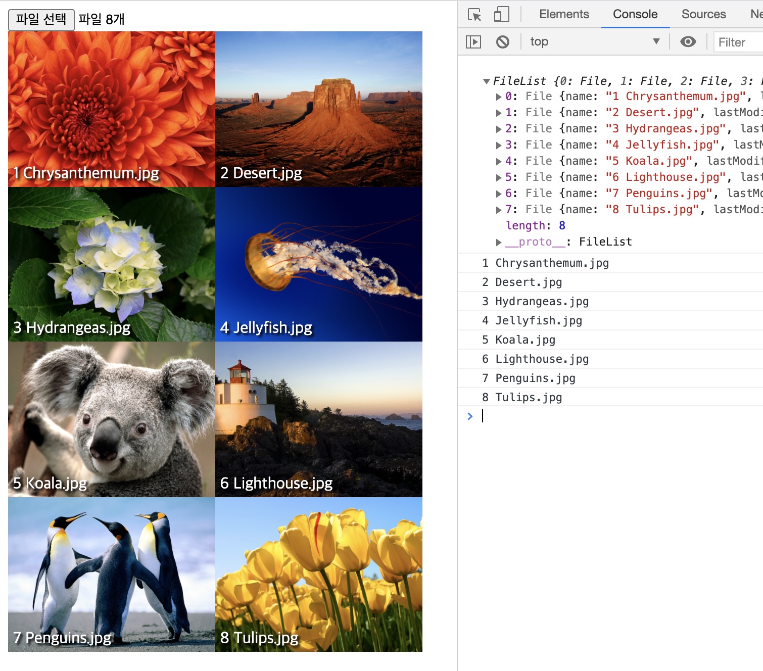 먼저 iput file 태그에 multiple 속성을 추가해 여러 이미지가 추가될 수 있도록 합니다. 다음 파일 배열(FileList)을 반복문을 돌려서 이미지 요소를 추가합니다. 이 때, reader.onload의 콜백 함수 안에 HTML 요소를 생성하거나 appendChild 하는 코드를 추가하지 않아야 합니다. 왜냐하면 이 콜백 함수는 비동기로 실행되므로 여기 안에서 HTML 처리를 하면 FileList 배열에 저장된 파일 순서와 렌더링되는 파일 순서가 같다는 것을 보장할 수 없기 때문입니다. 이미지 요소를 반복문에서 설정하고, 이미지가 로딩되면 그 콜백 함수에서 src를 바꾸는 방식으로 작성합니다.