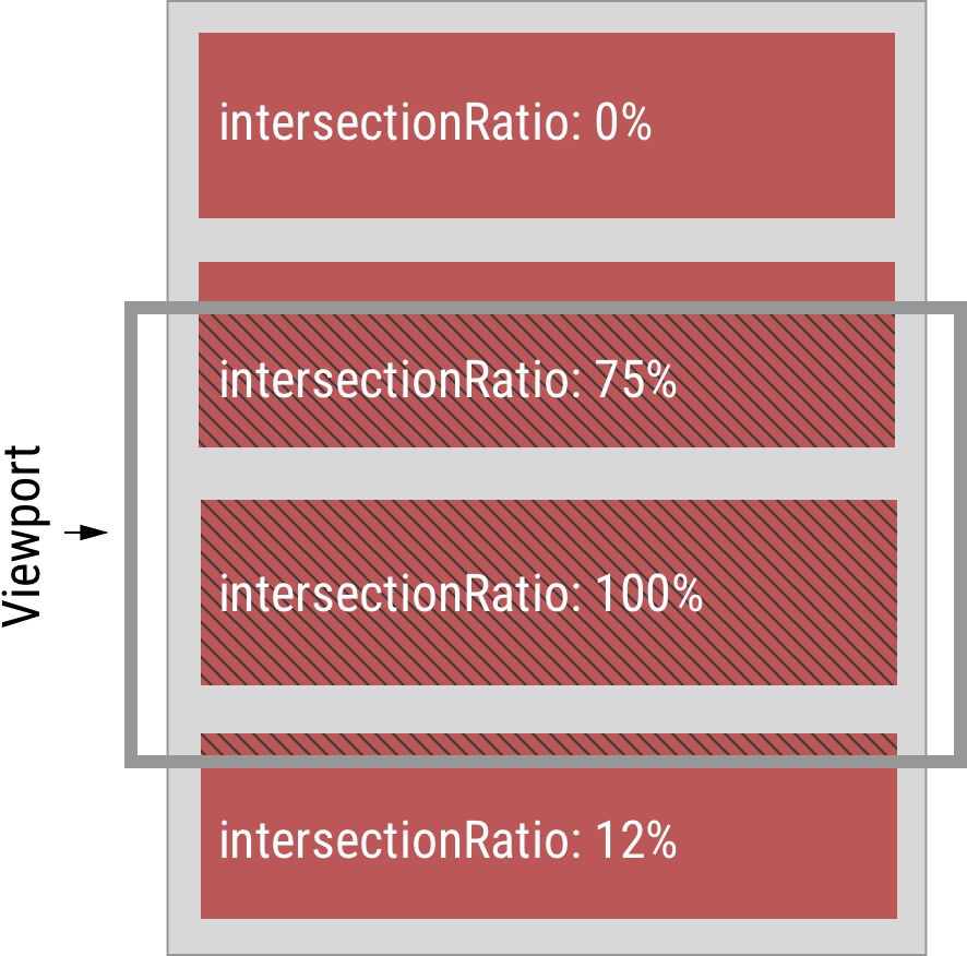 root 와 대상 요소가 교차하는 정도를 intersection ratio 라고 합니다. 이것은 대상 요소의 가시성 퍼센티지를 0.0 ~ 1.0의 숫자로 표현합니다.
