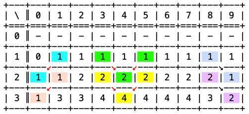 자리수 2와3도 똑같이 채웁니다.- 여기서 규칙을 발견할 수 있습니다. 규칙에 따라 도출된 점화식을 이용해 계산합니다.