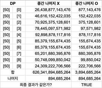 예를 들어 n = 50인 경우 중간 나머지를 하지 않았을 때와, 중간 나머지를 했을 때 최종적인 답의 계산 과정은 다음과 같습니다.