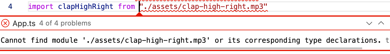 타입스크립트에서 아무런 준비 없이 mp3 를 import문 또는 require()를 써서 불러오려고 하면 Cannot filnd module ~ or its corresponding type declarations. 에러가 발생합니다. 이 에러를 방지하여 mp3 파일을 임포트할 수 있는 방법입니다.