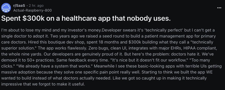 이 글은 30만 달러(약 4.2억원)와 18개월을 들여 기술적으로 완벽한 헬스케어 앱을 만들었지만, 정작 의사들이 실제 업무에 맞지 않아 사용하지 않는 상황을 다룹니다.