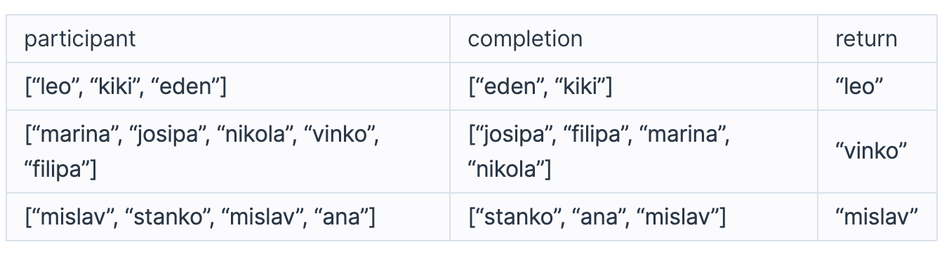 - 예제 #3: mislav는 참여자 명단에는 두 명이 있지만, 완주자 명단에는 한 명밖에 없기 때문에 한명은 완주하지 못했습니다.