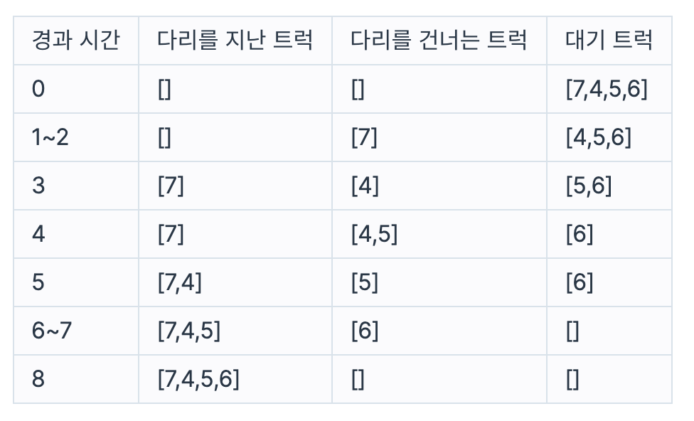 예를 들어, 길이가 2이고 10kg 무게를 견디는 다리가 있습니다. 무게가 [7, 4, 5, 6]kg인 트럭이 순서대로 최단 시간 안에 다리를 건너려면 다음과 같이 건너야 합니다.