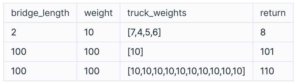 solution 함수의 매개변수로 다리 길이 bridge_length, 다리가 견딜 수 있는 무게 weight, 트럭별 무게 truck_weights가 주어집니다. 이때 모든 트럭이 다리를 건너려면 최소 몇 초가 걸리는지 return 하도록 solution 함수를 완성하세요.