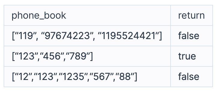 입출력 예 #3 첫 번째 전화번호, “12”가 두 번째 전화번호 “123”의 접두사입니다. 따라서 답은 false입니다.