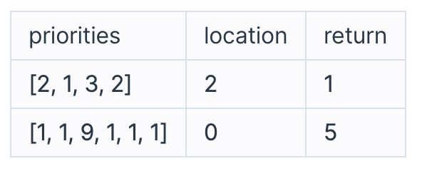 - location은 0 이상 (현재 대기목록에 있는 작업 수 - 1) 이하의 값을 가지며 대기목록의 가장 앞에 있으면 0, 두 번째에 있으면 1로 표현합니다.