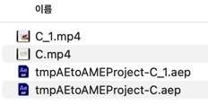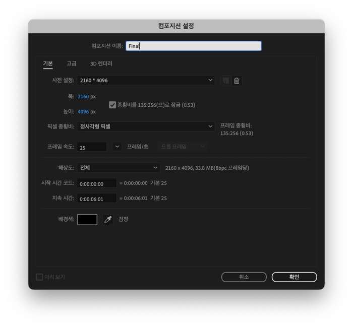 컴포지션이 추가됩니다. 목록에서 사전 설정의 텍스트를 클릭하면 내보내기 설정 창이 뜹니다.