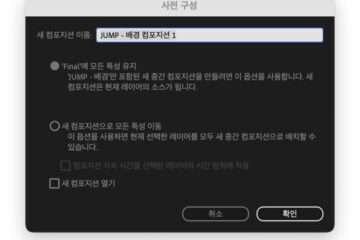 원본 영상을 레이어 영역에 추가한 뒤, 레이어 오른쪽 마우스 클릭 > 사전 구성... 메뉴를 클릭합니다. 사전 구성 창이 뜨면 확인을 눌러서 컴포지션으로 변환합니다.