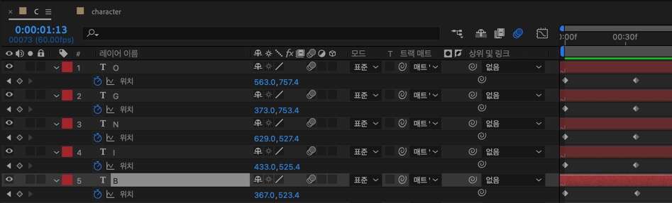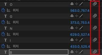예제에서는 0프레임에서는 글자 위치가 화면 바깥에 있고, 35프레임에는 위치가 화면 안에 들어와 있는 경우 아래와 같이 선형 애니메이션이 생깁니다.