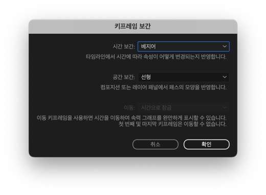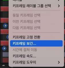 키프레임들을 선택한 후 마우스 오른쪽 버튼 > 키프레임 보간... 을 선택합니다.