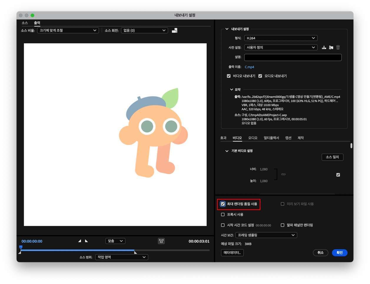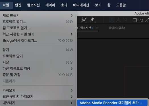 파일 > 내보내기 > Adobe Media Encoder 대기열에 추가... 를 클릭합니다.
