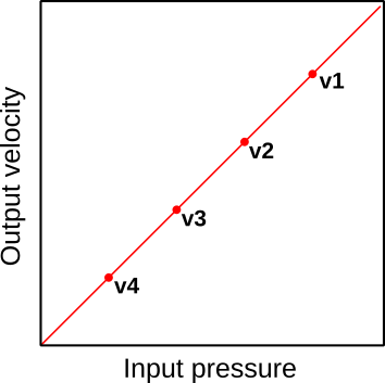 Figure 1. A velocity response curve. The X axis represents the pressure applied to the keys. The Y axis represents the velocity of the Note On events emitted in response to the pressure of a key. Here, the curve is actually a straight line, meaning the output velocity is directly and simply proportional to the input pressure. The red dots represent the 4 parameters that allow to reshape the curve. 그림 1. 벨로시티 응답 곡선. X축은 키에 가해지는 압력을 나타냅니다. Y축은 건반을 누르는 것에 반응하여 방출되는 Note On 이벤트의 벨로시티를 나타냅니다. 여기서 곡선은 실제로 직선입니다. 즉, 출력 벨로시티가 입력 압력에 직접적으로 비례한다는 의미입니다. 빨간색 점은 곡선의 모양을 변경할 수 있는 4가지 매개변수를 나타냅니다.