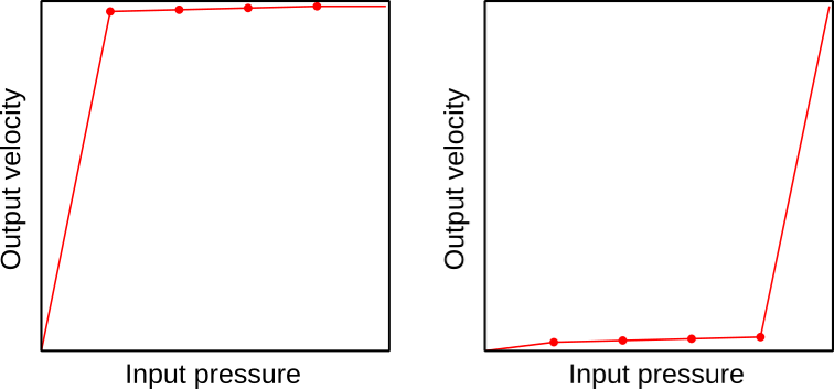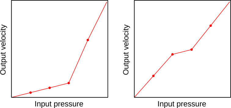 Figure 2. Maximal and minimal response curves. Left, the response curve produced by setting all parameters at their maximal values. Most key presses, except those applied with the faintest force, will hit the plateau at the top of the output range and will therefore constantly emit the highest velocity values. Right, the response curve produced by setting all parameters at their minimal values. Most key presses, except those applied with the greatest force, will hit the plateau at the bottom of the output range and will therefore constantly emit the lowest velocity values. 그림 2. 최대 및 최소 응답 곡선. 왼쪽은 모든 매개변수를 최대값으로 설정하여 생성된 응답 곡선입니다. 가장 약한 힘을 가한 키를 제외한 대부분의 키 누름은 출력 범위의 상단에 도달하므로 지속적으로 가장 높은 벨로시티 값을 방출합니다. 오른쪽은 모든 매개변수를 최소값으로 설정하여 생성된 응답 곡선입니다. 가장 큰 힘을 가하는 키를 제외한 대부분의 키 누르기는 출력 범위의 맨 아래에 있는 플래토(plateau)에 도달하므로 지속적으로 가장 낮은 벨로시티 값을 방출합니다.