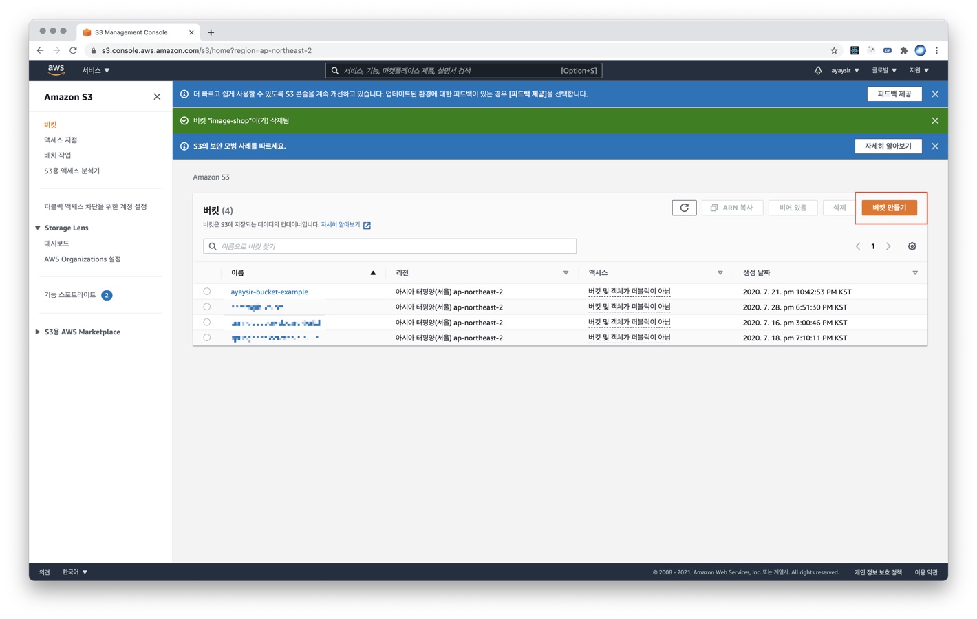 4) [버킷 만들기] 버튼을 클릭합니다.