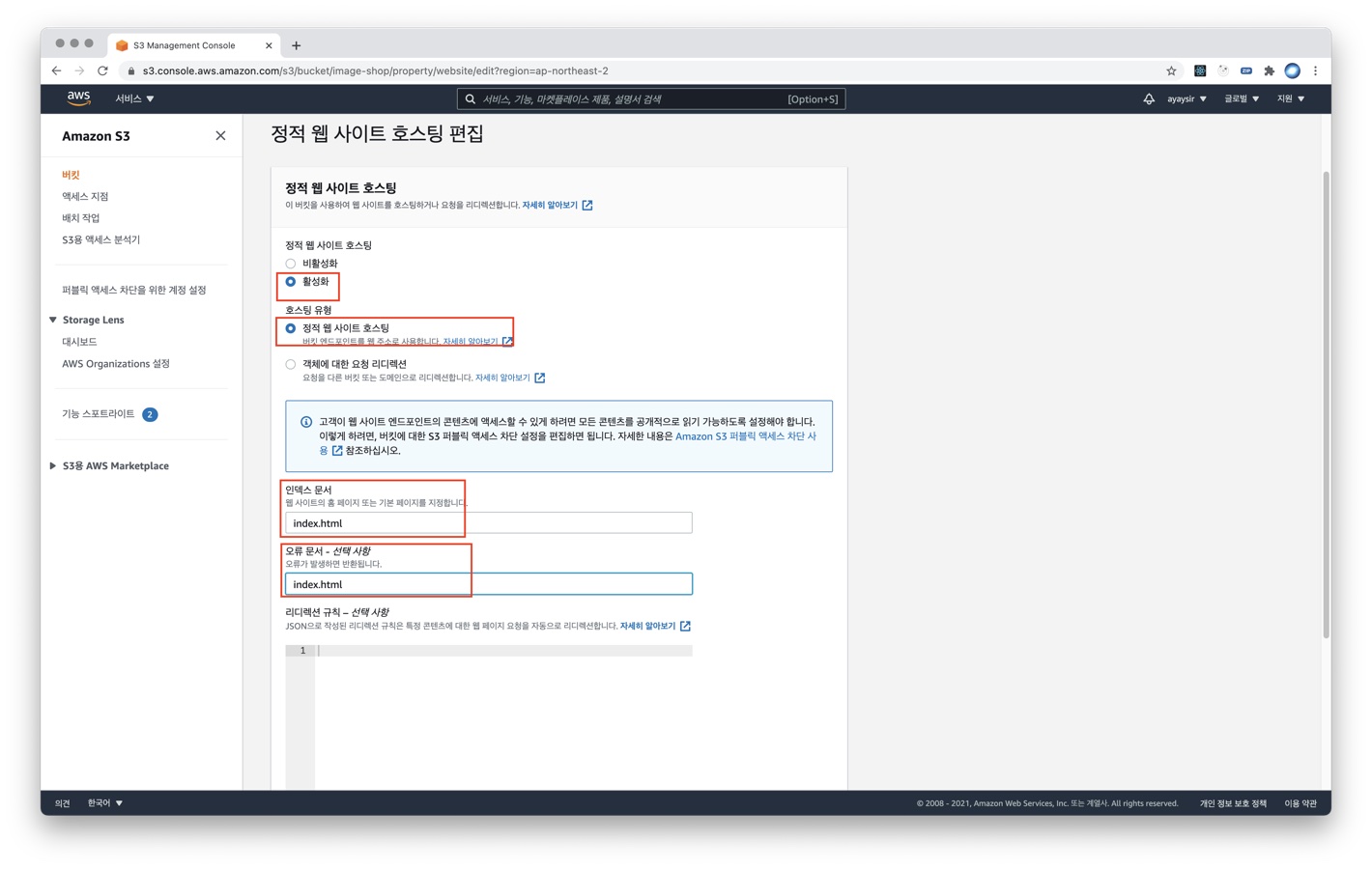 11) 정적 웹 사이트 호스팅을 활성화하고, 호스팅 유형으로 [정적 웹 사이트 호스팅]을 선택합니다. 인덱스 문서에 index.html 등 URL 을 입력하면 나올 홈 페이지 파일을 입력합니다.
