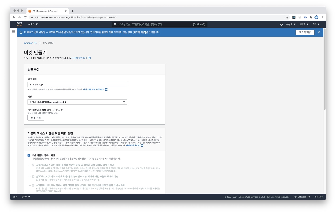 2) 버킷 이름, 리전(지역)을 입력합니다.
