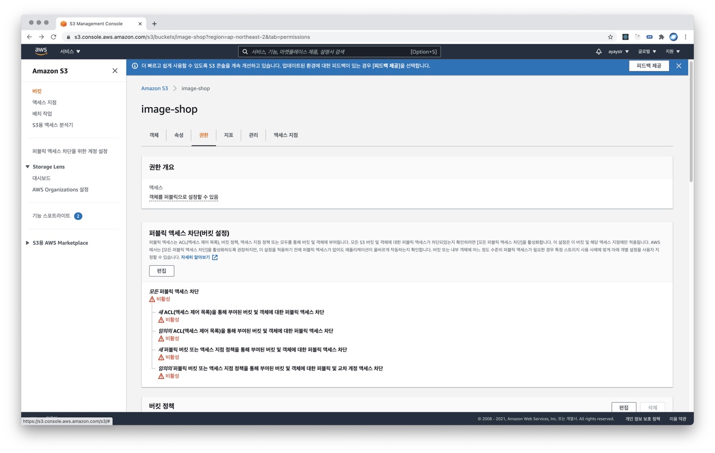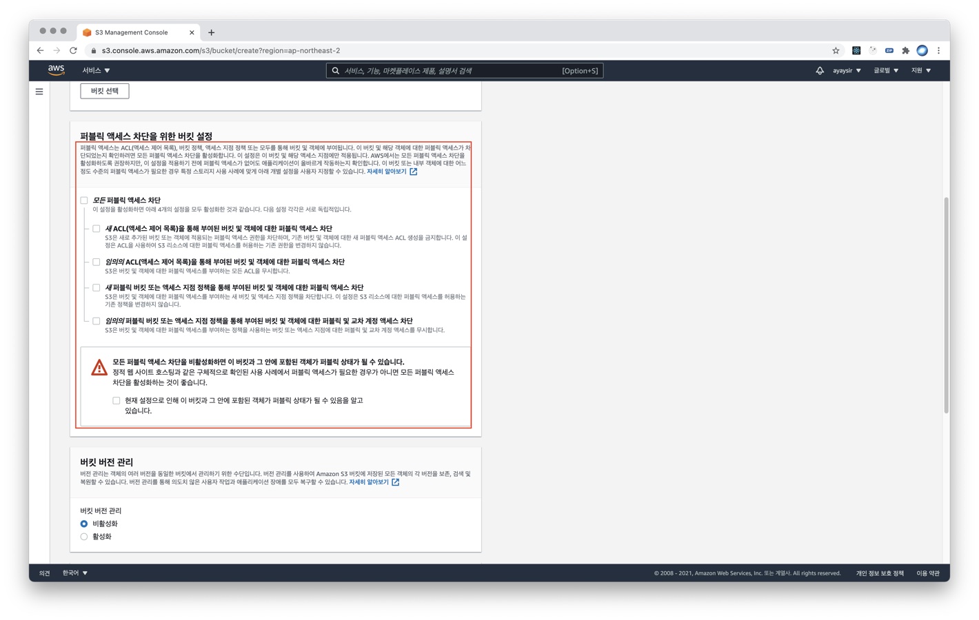 3) 스크롤을 밑으로 내리면 모든 퍼블릭 액세스 차단 란에 체크가 되어있는데, 해제합니다. 그리고 그 밑의 빨간색 세모 느낌표 란의 체크박스의 메시지를 읽고 클릭합니다.
