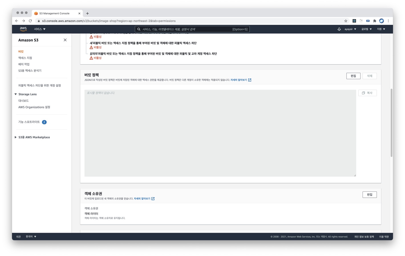 5) 만들어진 버킷 페이지에서 [권한] 탭을 클릭한 다음 퍼블릭 액세스 차단 설정이 활성화되어있으면 해제하고, 스크롤을 내리면 버킷 정책 란이 있는데 [편집] 버튼을 클릭합니다.