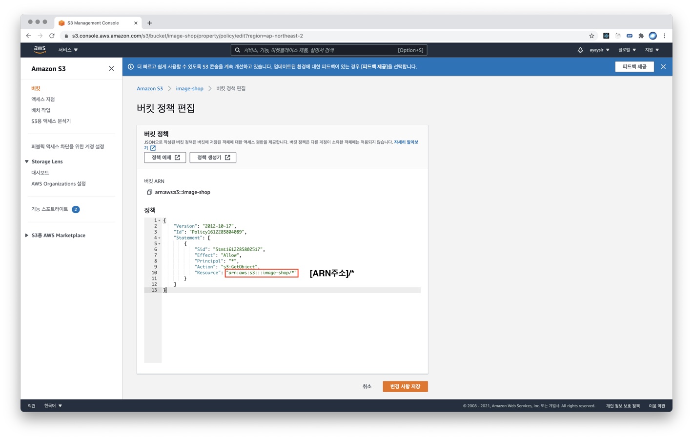 9) 버킷 정책 편집 창으로 돌아온 뒤, JSON을 붙여넣기 하고 [변경사항 저장] 버튼을 클릭합니다.