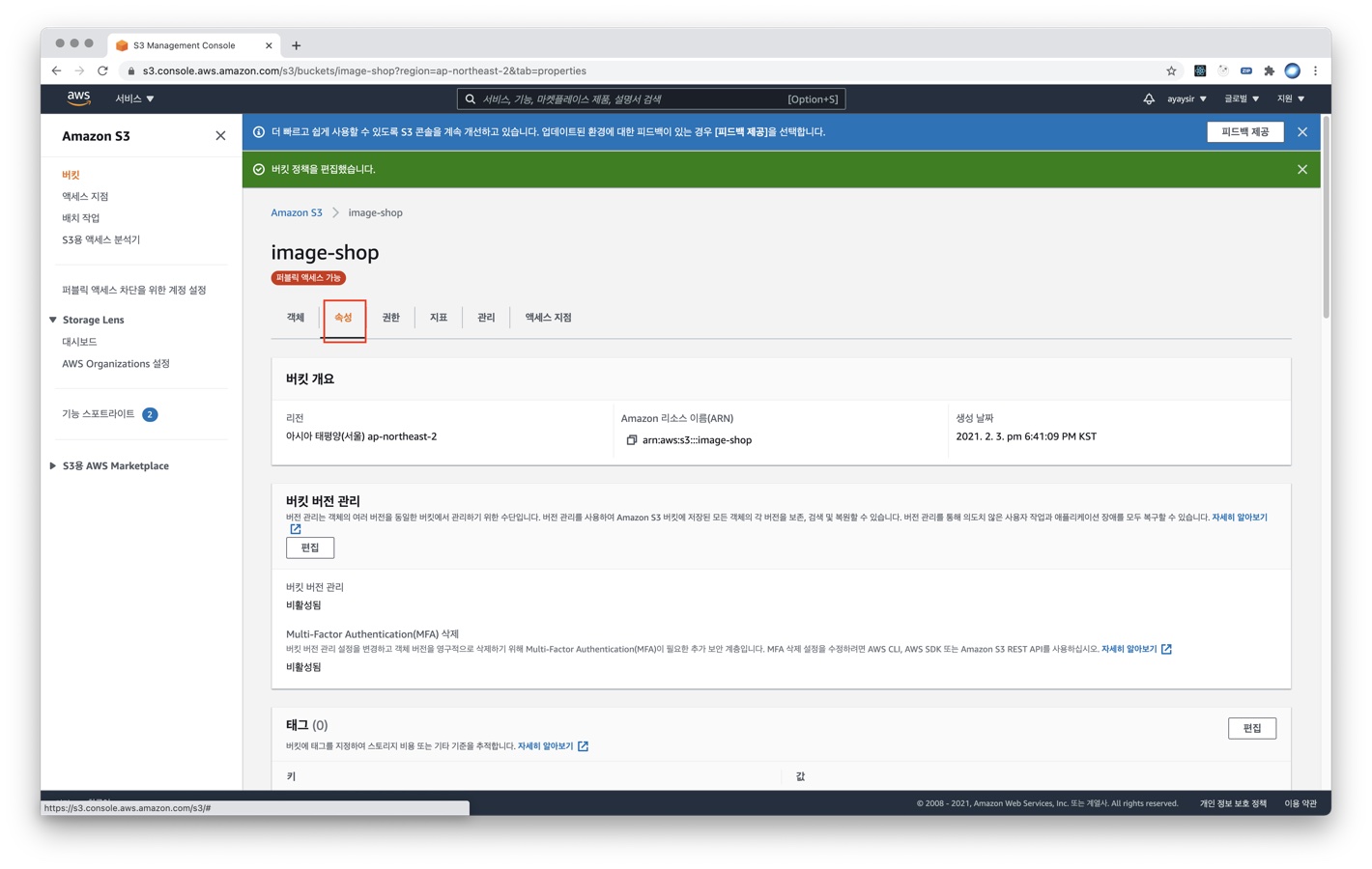 1) 로그인 후 AWS S3 Management Console 페이지로 접속한 다음 [버킷 만들기] 버튼을 클릭해 새로운 버튼을 만듭니다.