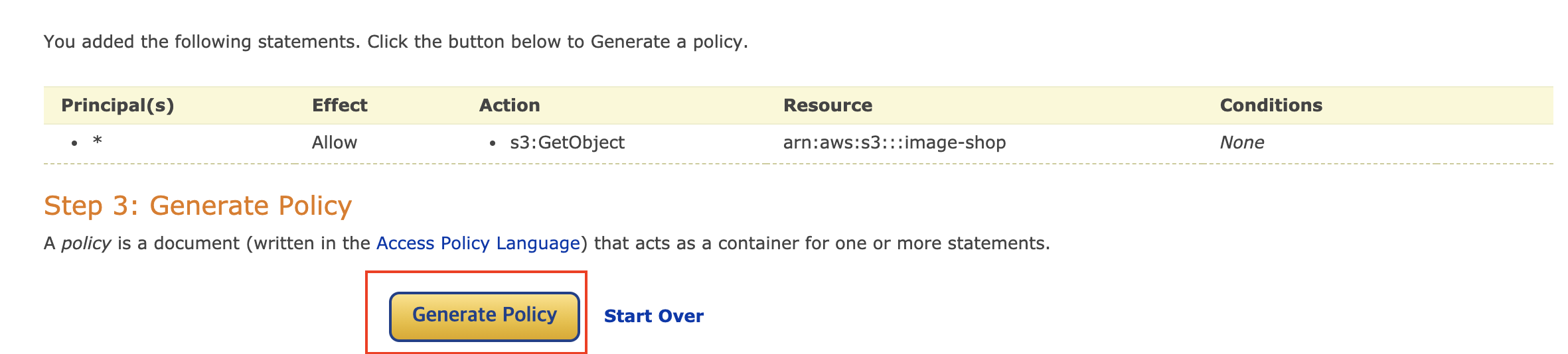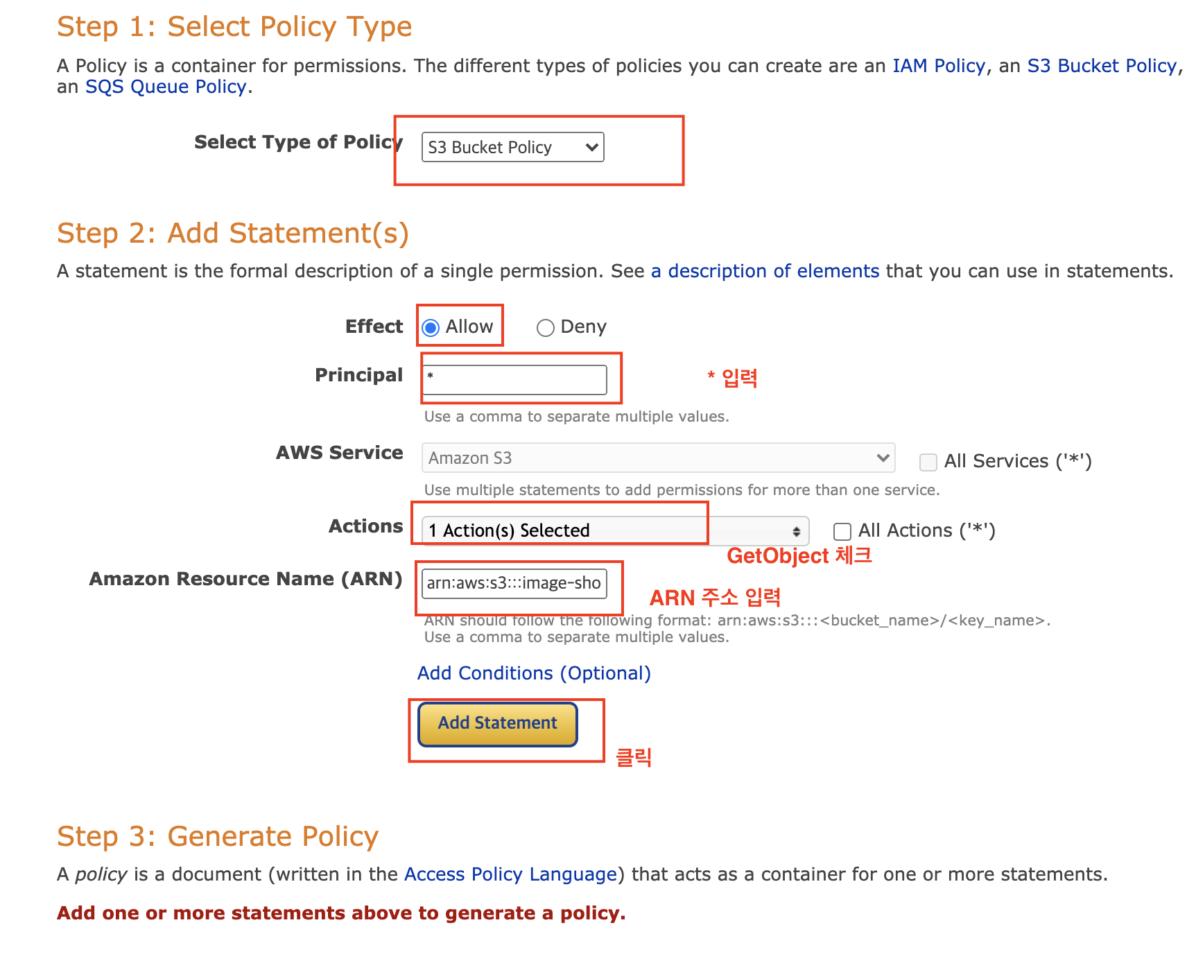 7) 정책 설정기에서 다음과 같이 설정 후, [Add Statement] 버튼을 클릭합니다.