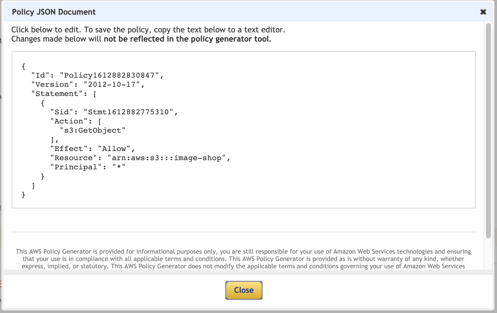 8) 다음, [Generate Policy] 버튼을 클릭한 다음, 출력되는 JSON 을 복사합니다.