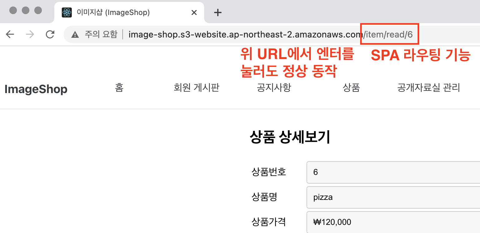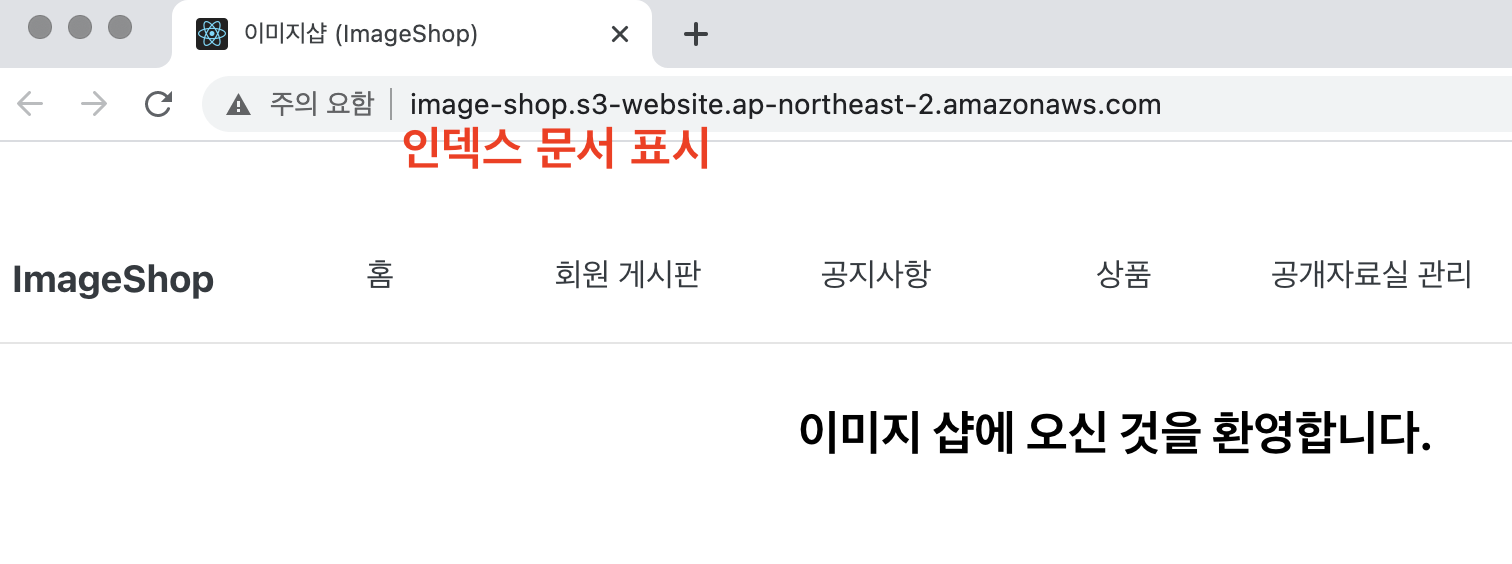 이 URL에 접속하여 인덱스 문서 및 라우팅 기능이 정상 동작하는지 확인합니다.