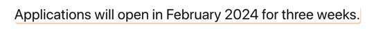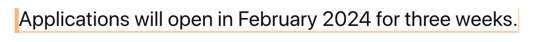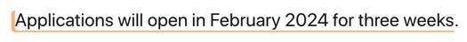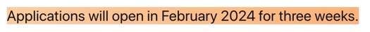 <span class="highlight-text">Applications will open in February 2024 for three weeks.</span>