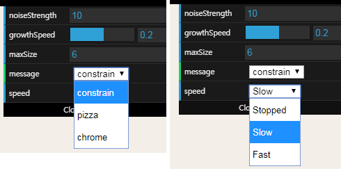gui.add(text, 'speed', { Stopped: 0, Slow: 0.1, Fast: 5 } );