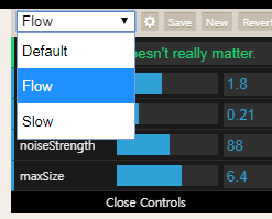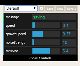 저장 설정을 변경하려면 톱니바퀴 모양의 아이콘을 클릭하십시오. 다음과 같이 GUI 값을 localStorage에 저장하거나 JSON 객체를 복사하여 소스 코드에 붙여 넣을 수 있습니다.