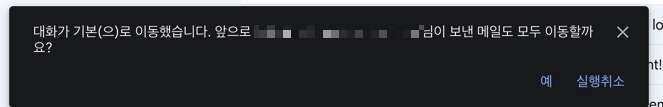 이메일을 프로모션에서 기본으로 이동하면 화면 하단에 팝업 메시지가 표시됩니다. Google이 이 이메일 주소에서 오는 향후 이메일을 프로모션 탭 대신 기본 탭으로 직접 이동하기를 원하는지 묻습니다.