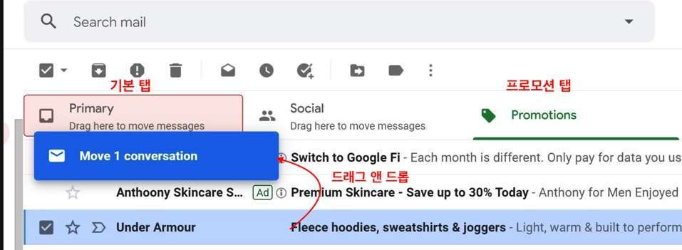중요한 이메일이 프로모션 탭으로 가지 않도록 하는 가장 간단한 방법은 해당 이메일을 기본 탭으로 끌어다 놓는 것입니다.