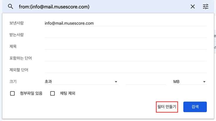 [필터 만들기]버튼을 클릭합니다. 보낸 사람 필드에 발신자 주소가 표시되지 않으면 받은 이메일에서 주소를 복사하여 여기에 붙여 넣으세요.
