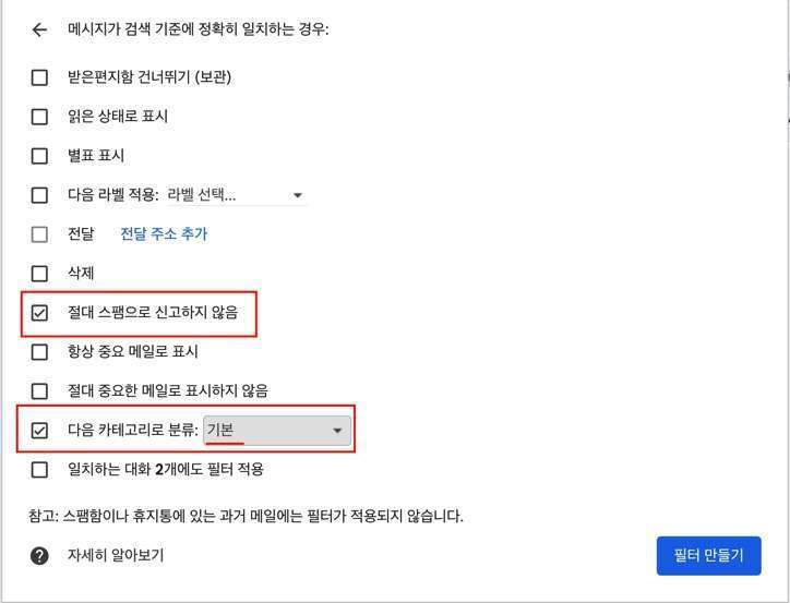 [절대 스팸으로 보내지 않음]을 선택합니다.- [다음 카테고리로 분류] 옆에 있는 드롭다운 목록에서