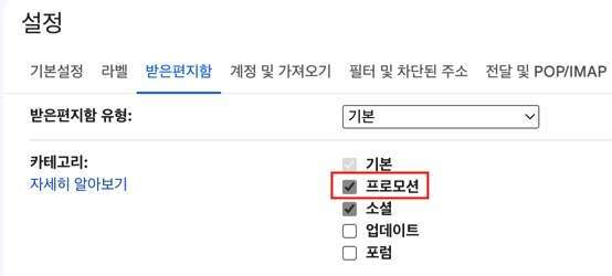 [받은편지함]섹션으로 이동합니다. [프로모션]옵션을 선택 취소합니다. 받은 편지함에 표시하려는 다른 탭을 관리할 수도 있습니다.