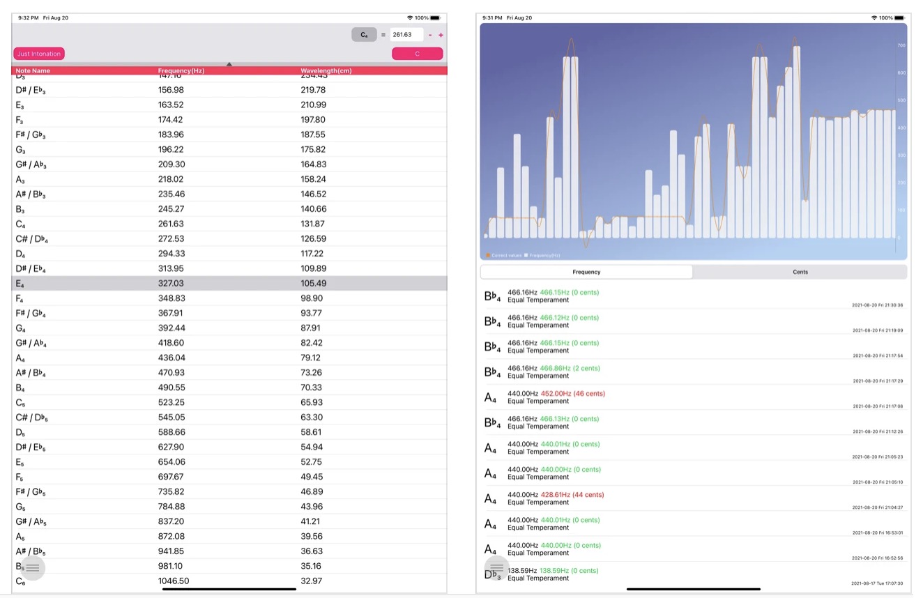 Tuner XR을 사용하면 바로크 시대와 현대를 아우르는 다양한 튜닝이 가능합니다. 순정율 튜닝, 미분율 튜닝 등 강력한 튜너를 만나보세요. 그리고 나의 튜닝 기록을 그래프와 표로 편하게 볼 수 있습니다. 또한 편리하게 이용할 수 있는 사운드 주파수 테이블이 있습니다.