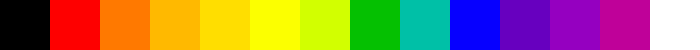 let colorArray = [ 0x000000, 0xfe0000, 0xff7900, 0xffb900, 0xffde00, 0xfcff00, 0xd2ff00, 0x05c000, 0x00c0a7, 0x0600ff, 0x6700bf, 0x9500c0, 0xbf0199, 0xffffff ]